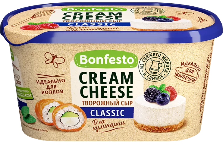 Cream Cheese Bonfesto – мягкий, слегка солоноватый, с умеренно выраженным вкусом творожный сыр, изготовленный из молока и густых сливок. Имеет нежную кремообразную консистенцию. Идеален для приготовления популярного десерта Чизкейк.